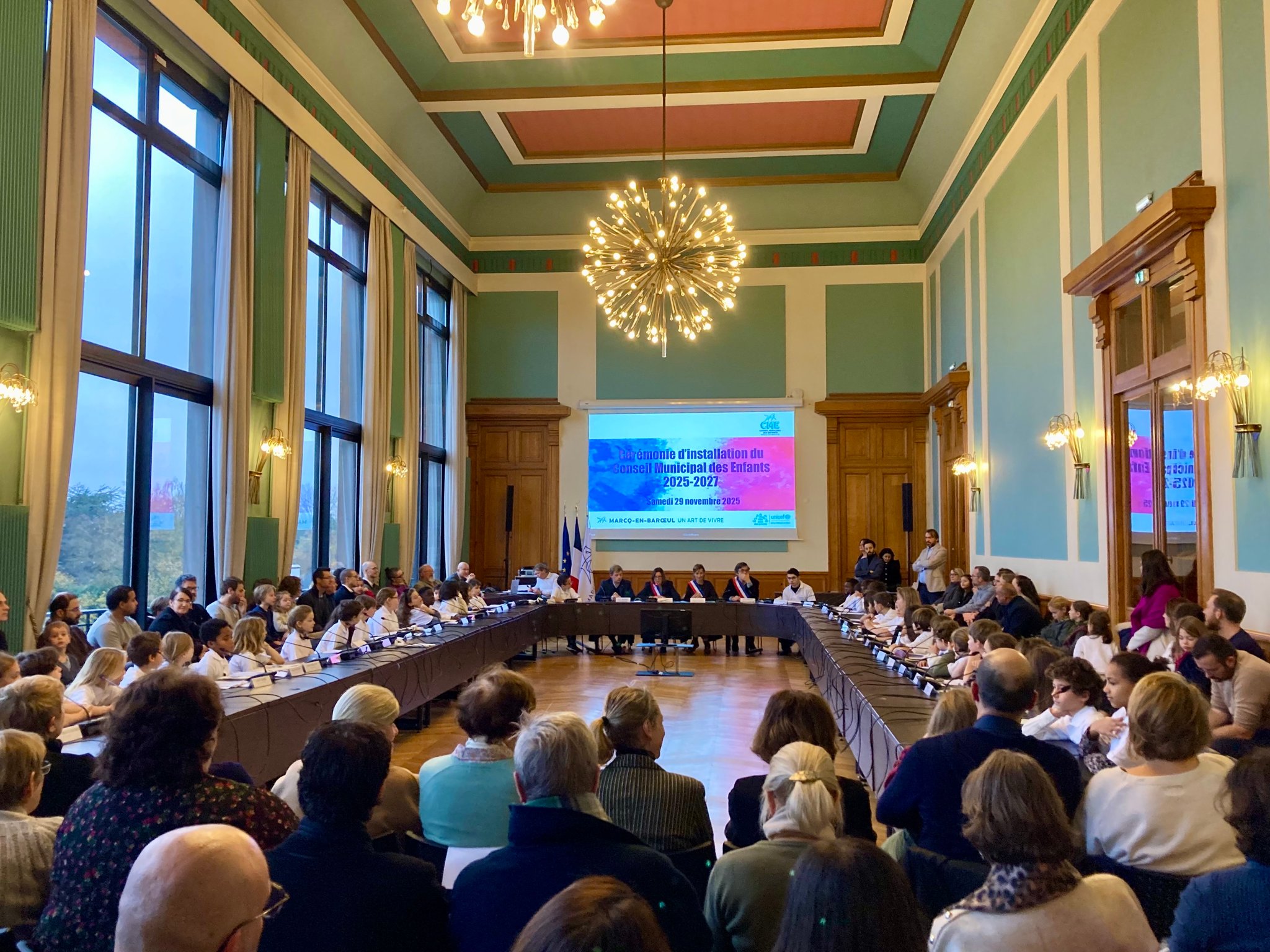 Le samedi 29 novembre avait lieu la cérémonie de prise de fonction des nouveaux élus au Conseil Municipal des Enfants de Marcq-en-Baroeul. Pour l'école Notre-Dame de Lourdes, quatre élèves ont été élus : Mila, Timothée, Gabrielle et Antoine (dans l'ordre sur la photo)